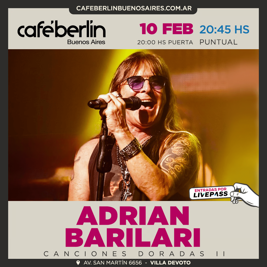 En esta ocasión será el Café Berlín de Villa Devoto el que el 10 de febrero se vestirá de gala para recibir a Adrián Barilari, presentando su último trabajo Canciones Doradas II, un recorrido musical lleno de clásicos de todas las épocas que han marcado generaciones.