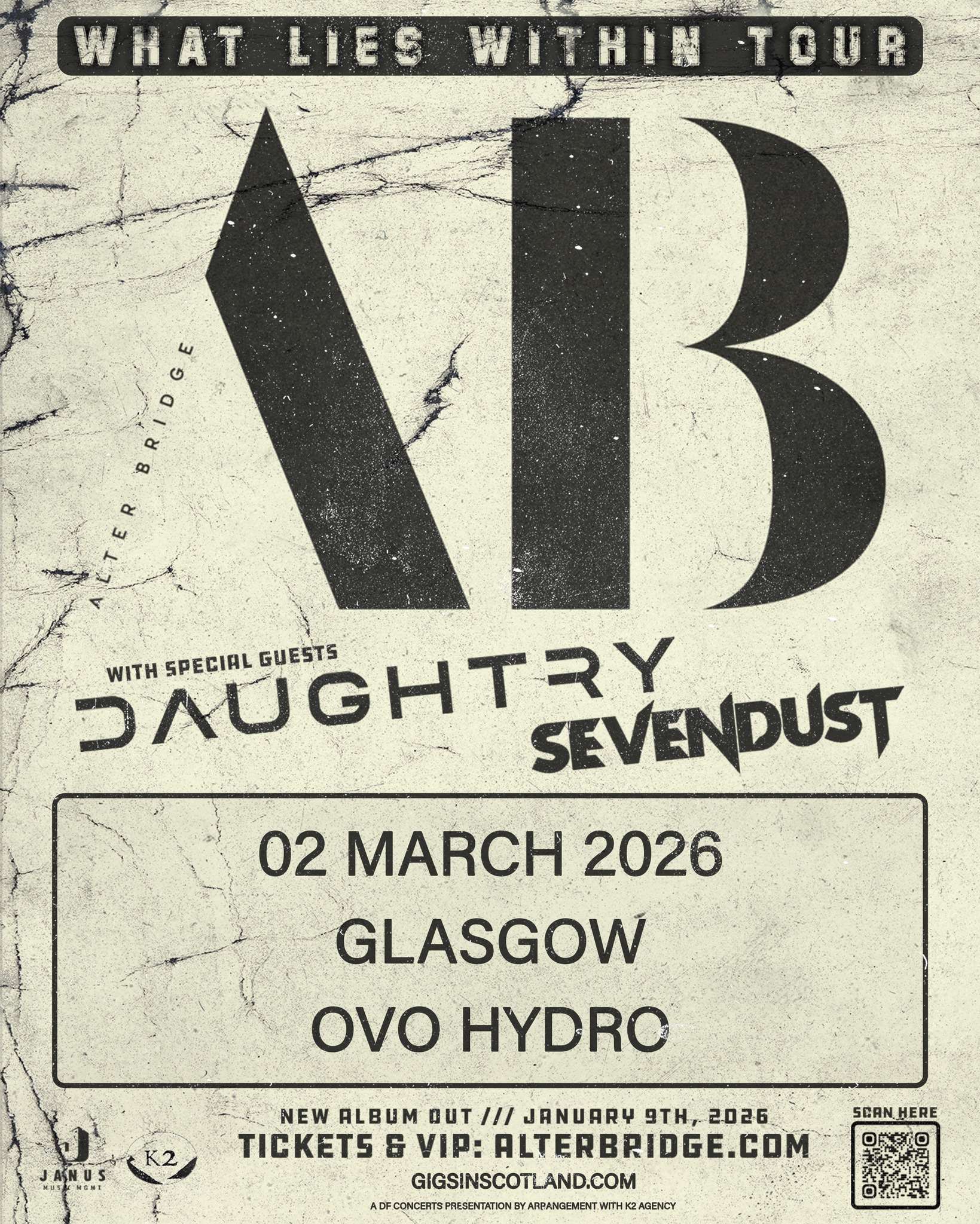 La banda de rock de Orlando Alter Bridge regresará a Glasgow por primera vez en tres años el próximo 2 de marzo en el OVO Hydro, como parte de su nueva gira “What Lies Within”. El cuarteto lanzó recientemente su nuevo álbum homónimo, “Alter Bridge”, y lo llevará de gira por arenas de Reino Unido y Europa.