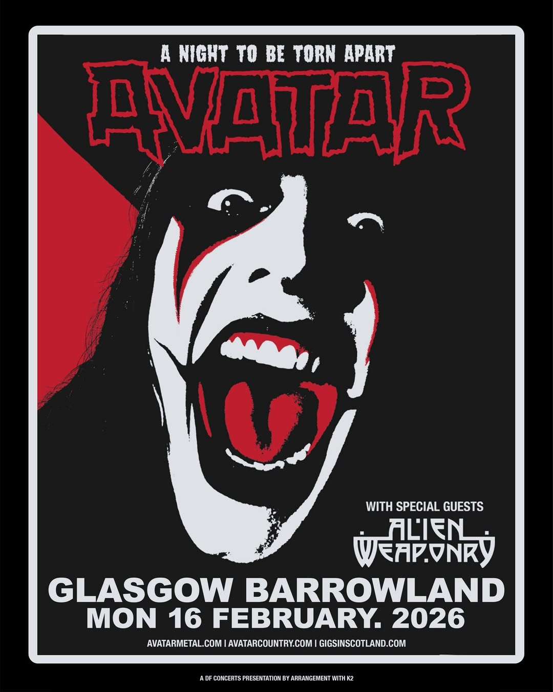 Avatar volverán a Glasgow el 16 de febrero de 2026 para presentarse en el Barrowland Ballroom, una de las salas más emblemáticas de la ciudad. La fecha forma parte de su gira “A Night To Be Torn Apart”, con la que la banda sueca continúa llevando su propuesta visual y musical a un nivel cada vez más sólido dentro del metal contemporáneo.