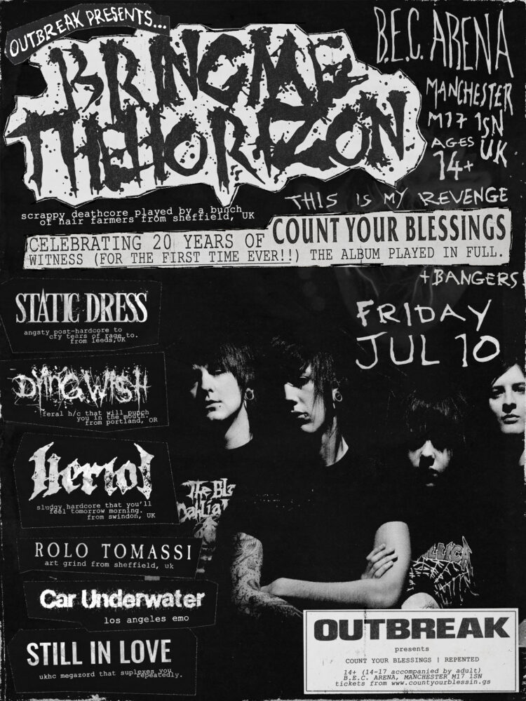 Una de las bandas alternativas más importantes e influyentes de los últimos tres lustros como son Bring Me The Horizon han sorprendido anunciando un concierto imponente en el B.E.C. Arena de Manchester, donde por primera vez en dos décadas interpretarán al completo su incendiario debut Count Your Blessings, el cual justamente el próximo 30 de octubre celebra sus primeros 20 años de existencia.
