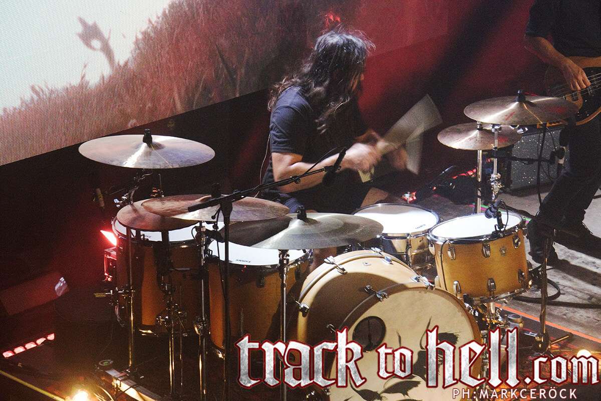 La ejecución técnica fue impecable: la batería de Isaac Faulk marcaba con precisión tanto los ritmos más vertiginosos como los cambios más sutiles, mientras que las guitarras de Paul Riedl y Morris Kolontyrsky se alternaban entre riffs aplastantes y texturas melódicas que se expandían en el espacio del escenario. Jeff Barrett en el bajo aportaba profundidad y resonancia, creando una base sólida que permitía que los elementos atmosféricos respiraran y ganaran peso.