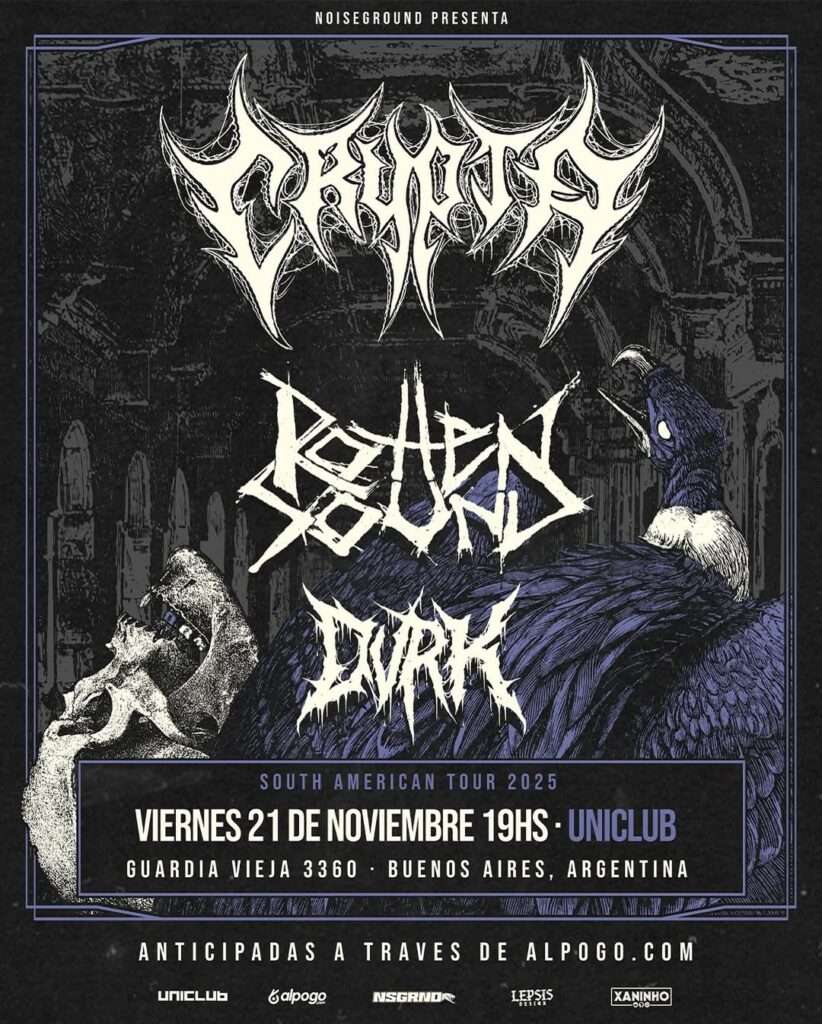 El próximo viernes 21 de noviembre, el escenario de Uniclub (Buenos Aires) será testigo de una de las fechas más intensas del año: Crypta, Rotten Sound y DVRK compartirán cartel en una jornada dedicada a las vertientes más feroces del metal extremo. La banda brasileña liderada por Fernanda Lira regresará a la Argentina con su más reciente álbum “Shades of Sorrow”, mientras que los finlandeses Rotten Sound presentarán su implacable “Apocalypse”, reafirmando su estatus como referentes del grindcore contemporáneo.