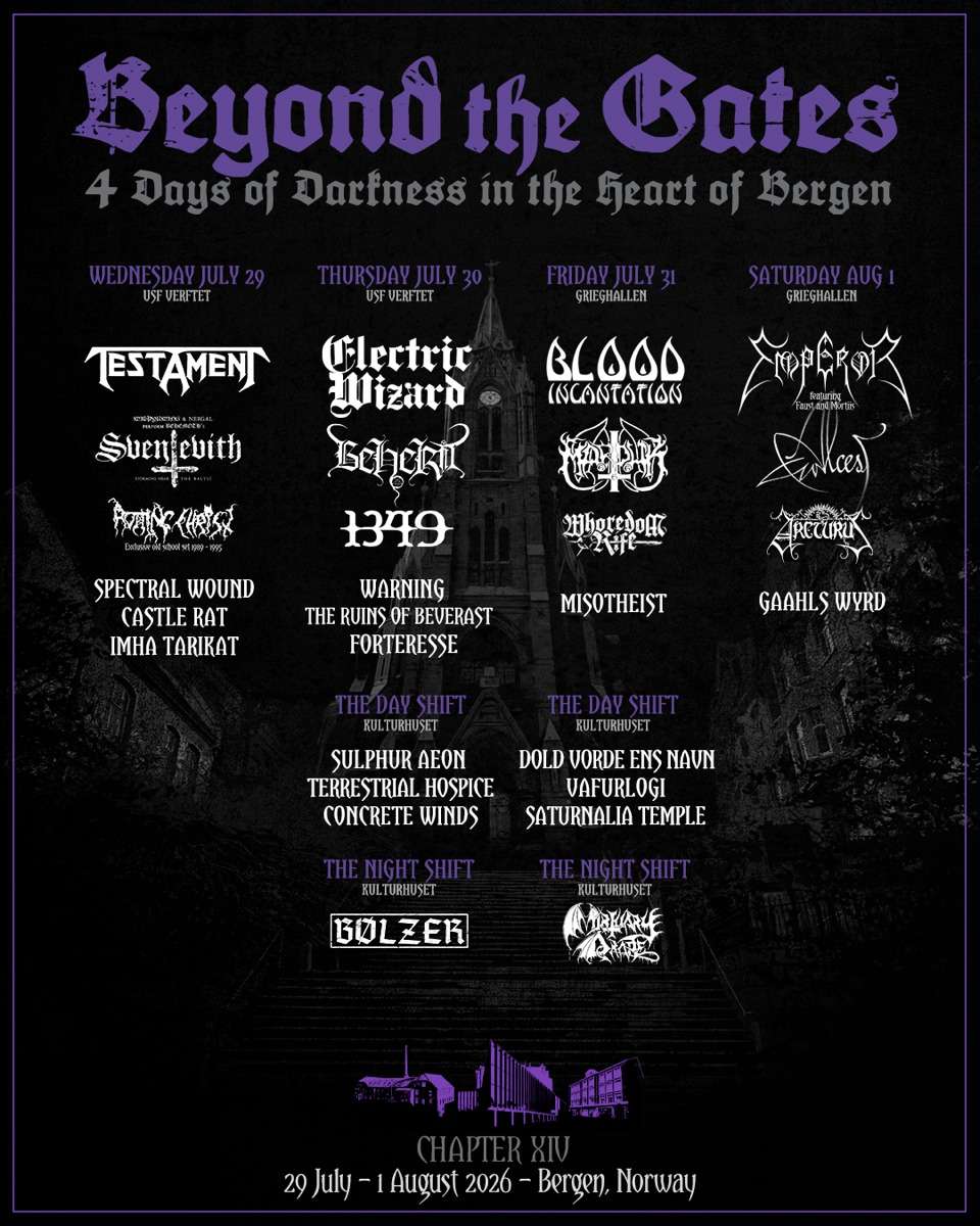 El Beyond The Gates Festival 2026 ha revelado los primeros detalles de su próxima edición, confirmando que celebrará su decimocuarta entrega como uno de los festivales más importantes y respetados de Noruega. Durante cuatro días, la ciudad de Bergen volverá a sumergirse en una atmósfera dominada por la oscuridad, la historia y el metal extremo, consolidando a Beyond The Gates como una cita imprescindible para los seguidores del black metal, death metal y las corrientes más profundas y ritualistas del género. Repartido entre espacios emblemáticos como USF Verftet, el histórico Grieghallen y el Kulturhuset, el festival combina grandes nombres internacionales con propuestas de culto, manteniendo una identidad muy definida y fiel a sus raíces.