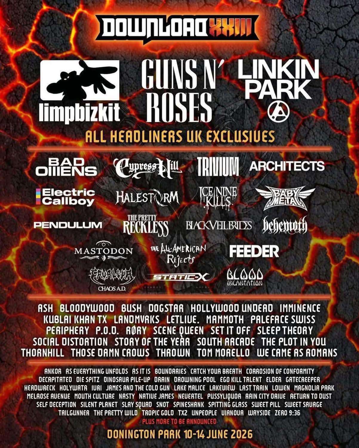 Cada una de las jornadas principales estará liderada por un gigante de distinta era. Limp Bizkit será el gran protagonista del viernes, marcando su primera vez como cabeza de cartel en Download y prometiendo un repaso lleno de energía a sus himnos del nü metal como “Break Stuff”, “My Generation” o “Rollin’”. El sábado estará reservado para Guns N’ Roses, en su regreso triunfal al escenario de Donington por primera vez desde 2018, encabezando un show que se perfila como uno de los más esperados del año. Finalmente, Linkin Park cerrará el festival el domingo con su regreso a los escenarios británicos tras una larga ausencia, en lo que será su primera actuación con nueva vocalista y un momento histórico tanto para la banda como para los fans del festival.