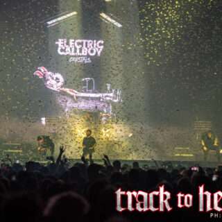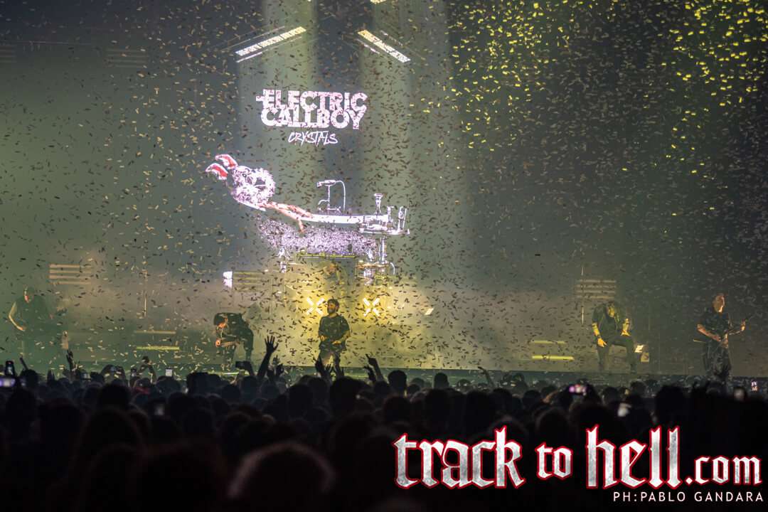 Y finalmente llegaba el momento más esperado de la noche. Los alemanes Electric Callboy daban comienzo a su particular fiesta con “Tanzeneid” y el público perdió el control por completo. Disfraces, moshpits, bailes de todo tipo y una buena energía que se salía del mismísimo recinto sería una manera rápida de resumir el concierto. “Hypa Hypa”, “Elevator Operator”, “We Got The Moves” e incluso algún clásico más oldschool como “Crystals” fueron las elecciones de la banda para poner el Sant Jordi patas arriba. Destacar también el cover de “Everytime We Touch” que, para el directo, contó con una parte del tema en acústico con Nico y Kevin situados entre el público con un piano y sus voces, ofreciendo una experiencia íntima y única para todos los asistentes.