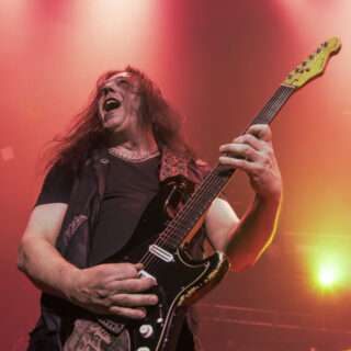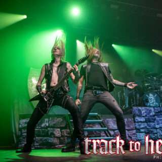 Joacim Cans irrumpió en el escenario con esa vitalidad que pocos vocalistas logran conservar con los años. Cada palabra suya resonaba como una orden, como una invitación a la batalla. «¡Bienvenidos a la cruzada!», declaró, y la sala explotó. El riff galopante de “Heeding the Call” nos lanzó a todos al abismo de la locura. La batería de David Wallin latía como un corazón impío, golpeando con furia, y las primeras olas de energía recorrieron el Razzmatazz entre puños alzados.