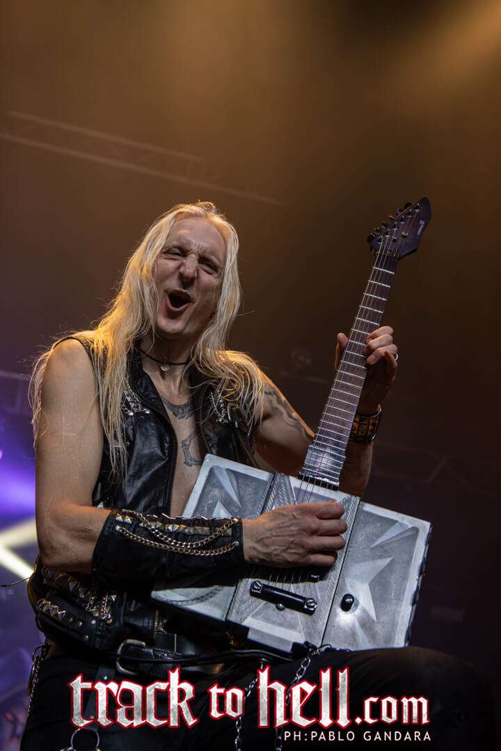 La noche, aunque cargada de furia, también dejó espacio para la nostalgia. “Renegade” irrumpió como un eco lejano de los años noventa, recordándonos que los martillos existían mucho antes de las nuevas victorias. Allí, en medio del rugido, Oscar Dronjak bromeó sobre los inicios de la banda, lanzando un guiño cómplice a un pasado glorioso.
