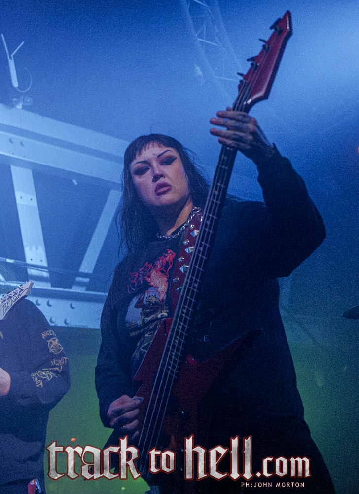 Esto terminó siendo algo positivo, ya que me llevé una grata sorpresa con todas las bandas que tocaron. Cada una ofreció algo ligeramente distinto en términos de energía y estilo. Frozen Soul fueron los encargados de abrir la noche y no perdieron tiempo en animar al público, con quizá uno de los crowd surfers más rápidos que haya visto en un concierto. También consiguieron que los pits se activaran con la interpretación en directo de una de sus canciones más recientes, “Absolute Zero”. A pesar de ser una banda procedente del soleado Texas, parecen tener especial predilección por las temáticas relacionadas con el hielo y el frío. Incluso la iluminación reflejaba esto, con predominio de tonos azules y turquesas fríos, acompañados ocasionalmente por luces verdes o púrpuras. El escenario principal de The Garage se encontraba adecuadamente oscuro, creando una atmósfera bastante ominosa cuando miraba hacia el pit y solo veía destellos del público iluminados por estrobos violentos que parpadeaban al ritmo de los blast beats.