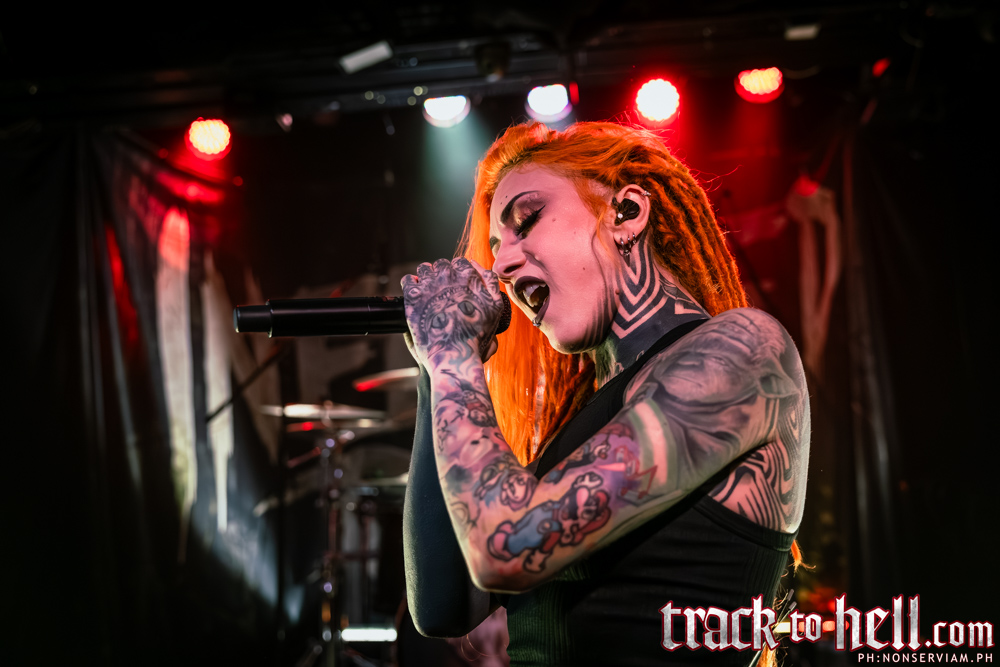 Finalmente, llegó el turno de Infected Rain. Con un escenario decorado con pantallas que imitaban lápidas y una introducción audiovisual con estética cyberpunk, la banda abrió con “THE ANSWER IS YOU”. La vocalista Elena Cataraga, conocida como Lena Scissorhands, mostró desde el primer momento su impresionante versatilidad vocal, alternando entre melodías limpias y guturales con total fluidez.