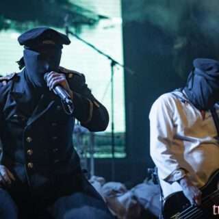 Y a las 21:30 en punto, se abrió el telón y pudimos ver el escenario completamente a oscuras, pero incluso en ese contexto se podían distinguir las bolsas de arena dispuestas alrededor de la batería, manteniendo la estética de Kanonenfieber. Mientras se alargaba un poco la salida de la banda la gente empezó a cantar el “Olé Olé” usando sólo el “Fieber” del nombre, hasta que de repente comenzamos a escuchar la intro “Grossmachtfantasie”. Ya para ese momento era evidente el tremendo calor que se sentía, entre la acumulación de gente y la falta de corrientes de aire, así que pensé por un momento que Kanonenfieber querrían dejar alguna de las ropas de lado. La cosa no iba a ser así, porque pudimos ver a los miembros de Kanonenfieber alistados en lo alto de la escalera, todos con sus uniformes, gorras y máscaras características, con el guitarrista siendo el primero en tomar posición en medio del escenario y comenzar a tocar su parte de la introducción, musicalizando la salida de sus compañeros de unidad a las tablas.