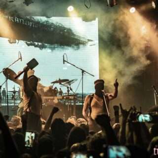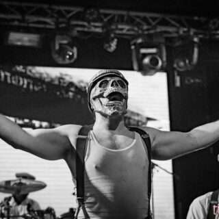 Para el final, la banda dejó “Ausblutungsschlacht”, canción donde Noise se saca de la manga (bueno, la manga imaginaria considerando que andaba con la musculosa de vuelta) su imagen más característica, con su máscara de cráneo acompañada de su casco, apostándose en medio del escenario mientras de fondo sonaba la marcha de la intro. Cantando con la máscara moviéndose a la par, Noise representaba a la muerte “cobrándose las vidas” de sus compañeros de unidad, mientras sonaban de fondo más riffs pesados y más samples de discursos de la época, en el momento más teatral de toda la noche.