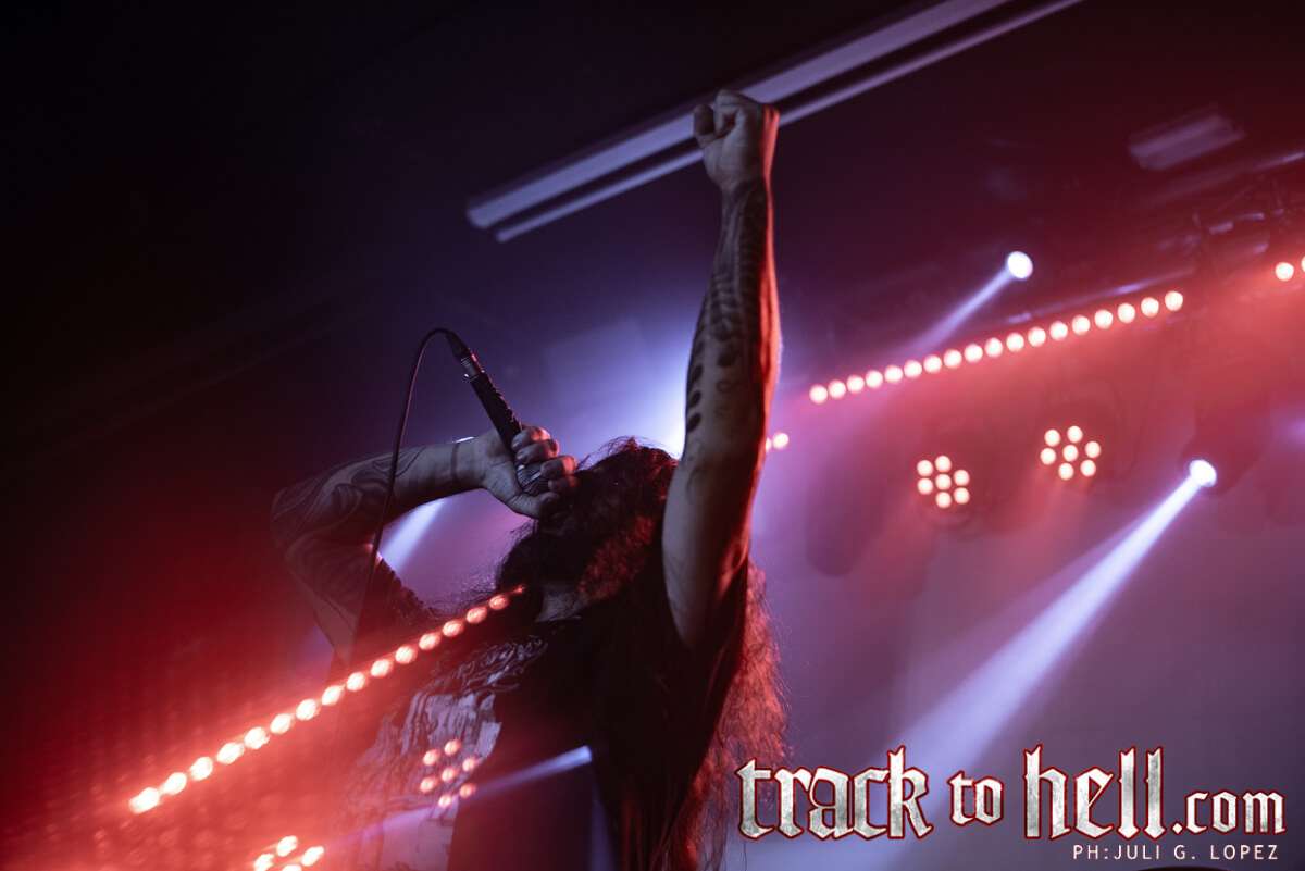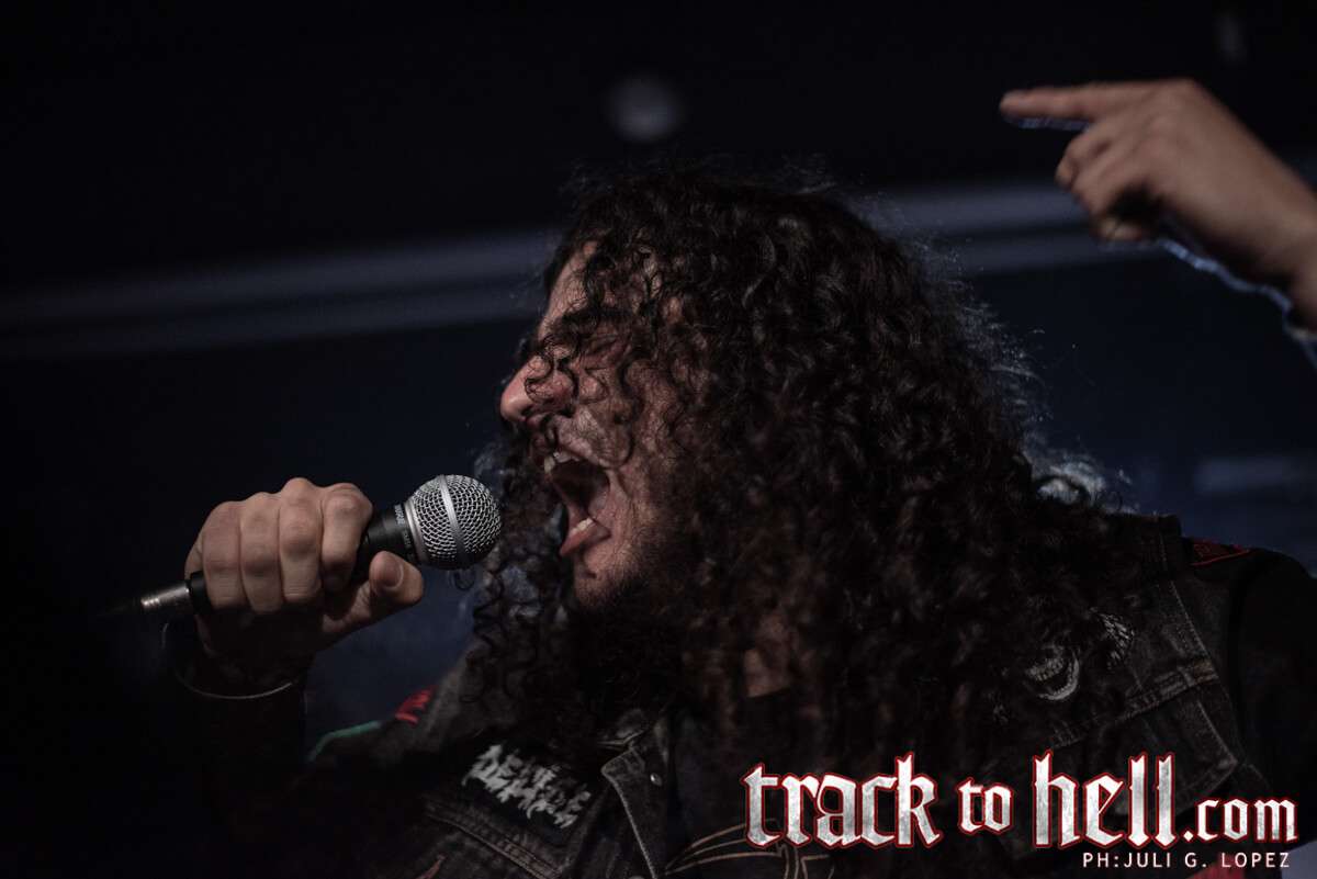 Tras los locales, llegó el turno de viajar al país vecino con Resurge, que irrumpieron con un death metal crudo, duro y con un punto cavernoso que hizo vibrar la sala. Su puesta en escena, decorada con banners y telas, creó un ambiente ritualístico que encajó a la perfección con su propuesta. El vocalista, en constante movimiento, supo conectar con el público y lo mantuvo en un estado permanente de agitación. La mezcla de thrash/death de los portugueses resonó con una fuerza innegable, provocando los primeros moshes serios de la noche.