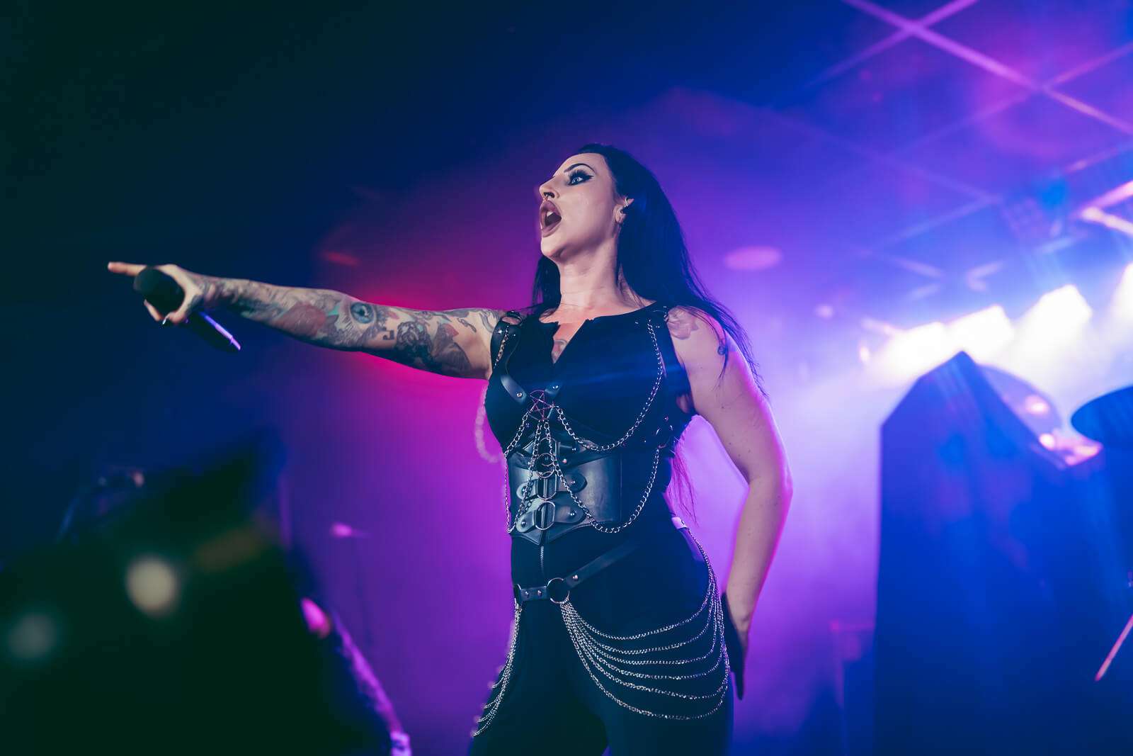 Los encargados de abrir la velada fueron los suecos Eleine, quienes encendieron la mecha de la noche con una sala ya prácticamente llena. Puntuales a las 19:30, desplegaron su poderosa mezcla de guitarras afiladas y melodías sinfónicas, liderados por la imponente voz de Madeleine Liljestam. La vocalista, majestuosa al frente, alternó con destreza entre registros guturales y voces limpias, respaldada por los coros del guitarrista Rikard Ekberg.