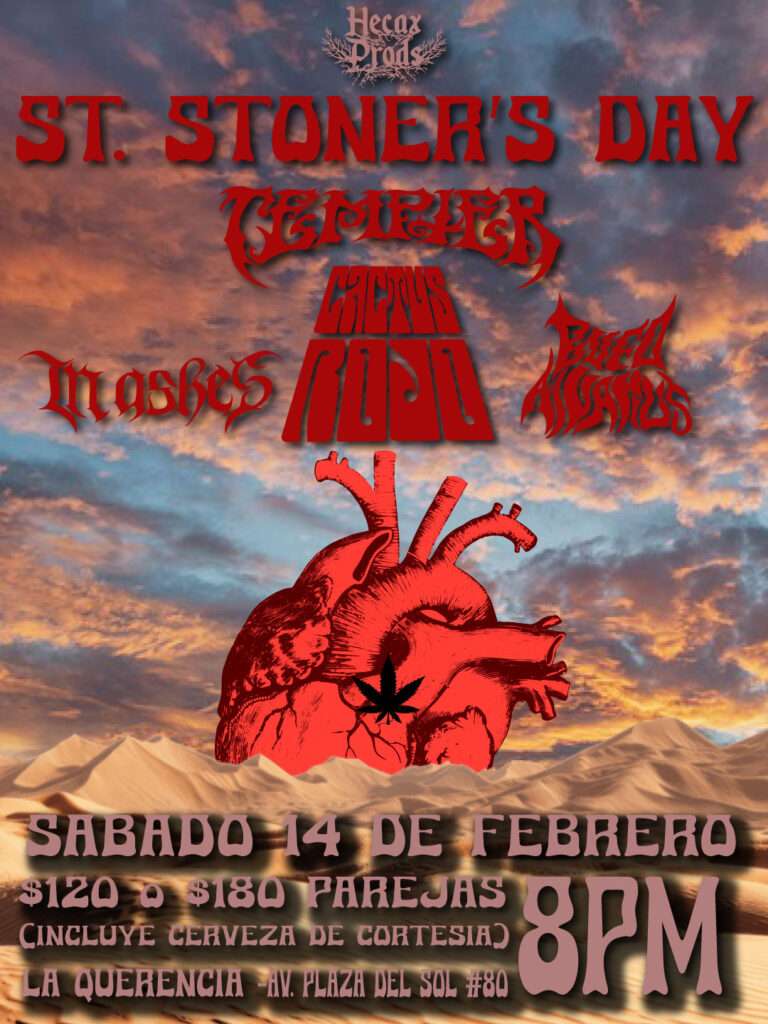 Este sábado 14 de febrero, la ciudad de Guadalajara cumplirá 484 años de existencia, pero la verdadera fiesta se vivirá en la cantina La Querencia (Av. Plaza del Sol #80, Condoplaza, Zapopan) con el “St. Stoner’s Day” de Hecax Prods, que presentará a algunas de las mejores propuestas de stoner, doom y sludge del estado.
