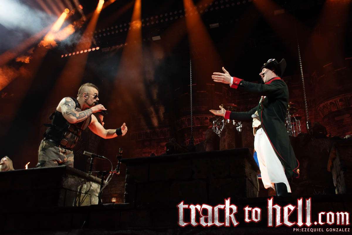 Entre bandas, cuando ya se olía la llegada del plato fuerte, se escuchaba al unísono el coreo icónico de “Swedish Pagans”. Hasta que Napoleón Bonaparte se anunció en el centro del campo entre antorchas, donde monologó en contra de los ingleses y sus logros con su estúpido acento francés. Luego, el bárbaro Genghis Khan irrumpió en escena para un choque de “Civilización y Barbarie”. Para el próximo acto de esta breve obra, Julio César se hizo presente como último bastión, desafiando a los otros líderes, solo para terminar siendo apuñalado por el Khan y Napoleón. Finalmente, llegaron los caballeros templarios, quienes, tras sacarse sus yelmos, calzaron sus instrumentos y marcharon desde el centro del campo al escenario a través de un puente elevado, terminando así esta obra de teatro y dando inicio al recital con “Templars”.