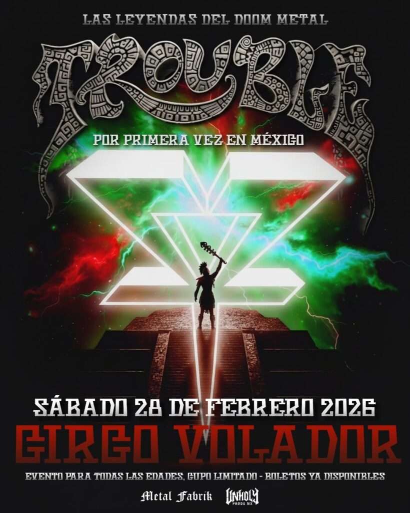 Por primera vez en México, las leyendas del doom metal, Trouble, se presentarán en nuestro país con 2 fechas, el 27 y 28 de febrero del 2026. En Monterrey su presentación será en el Cafe Iguana el 27 y en CDMX será en las instalaciones del Circo Volador.