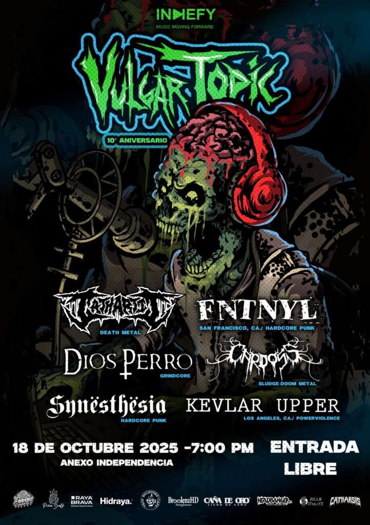 Bajo el nombre Vulgar Feast 2025, este importante medio mexicano ha reunido a algunas de las agrupaciones independientes del punk y metal más emocionantes de la ciudad, como los veteranos del grindcore mexicano Dios Perro, la fuerza del death metal jalisciense Cathartic, el intenso doom/sludge de Cardoss y el poderoso hardcore punk de Synësthësia, además de dos actos directos de California: FNTNYL (también de hardcore punk) y Kevlar Upper (powerviolence).