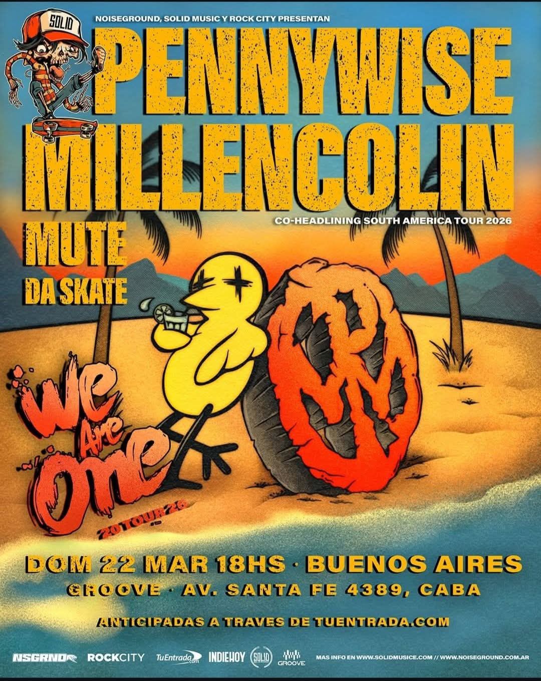 Hay shows que se anuncian y uno simplemente sabe que va a ser especial. Y hay otros que se anuncian y uno tiene que sentarse un momento a procesar lo que está leyendo. Este es de los segundos. Pennywise y Millencolin llegan juntos a Argentina el sábado 22 de marzo en el marco del “We Are One South American Tour 2026“, y la cita es en Palermo Groove (Av. Santa Fe 4389, CABA) desde las 19hs.